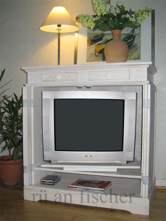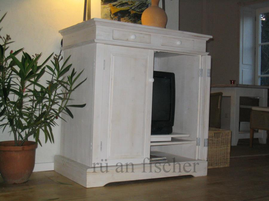 Fernsehschrank mit Füllungstüren und Doppelscharnieren.